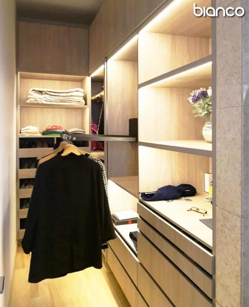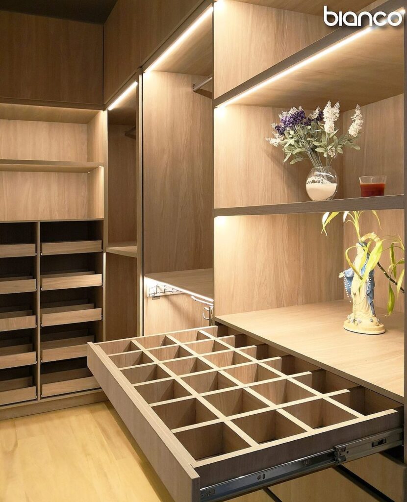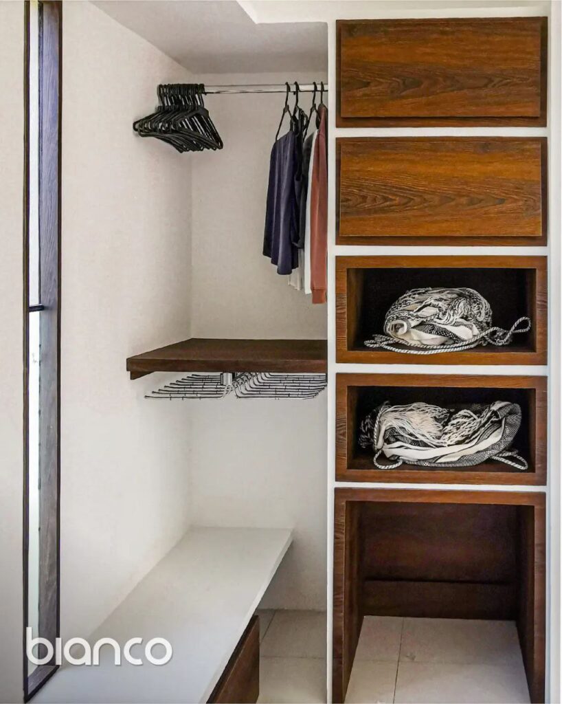 Puede colocarse dentro o fuera del dormitorio, en este caso se trata de un mueble ya sea prefabricado o hecho a la medida con diferentes niveles y estantes que podemos aprovechar para complementar con nuestras propias cajas y métodos de organización a manera de mantenerlo siempre muy bien ordenado.