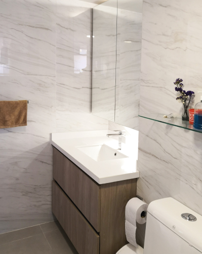 Todo en este baño responde a un criterio funcional. El mobiliario sin tiradores, hecho a medida, procura por el almacenaje inferior ser muy funcional y llegar a piso en caso que se requiera más espacio para guardar elementos del baño, en este caso la poceta está bajo el mesón que puede ser hecho en piedras naturales o sintéticas, logrando aprovechar más áreas de trabajo.